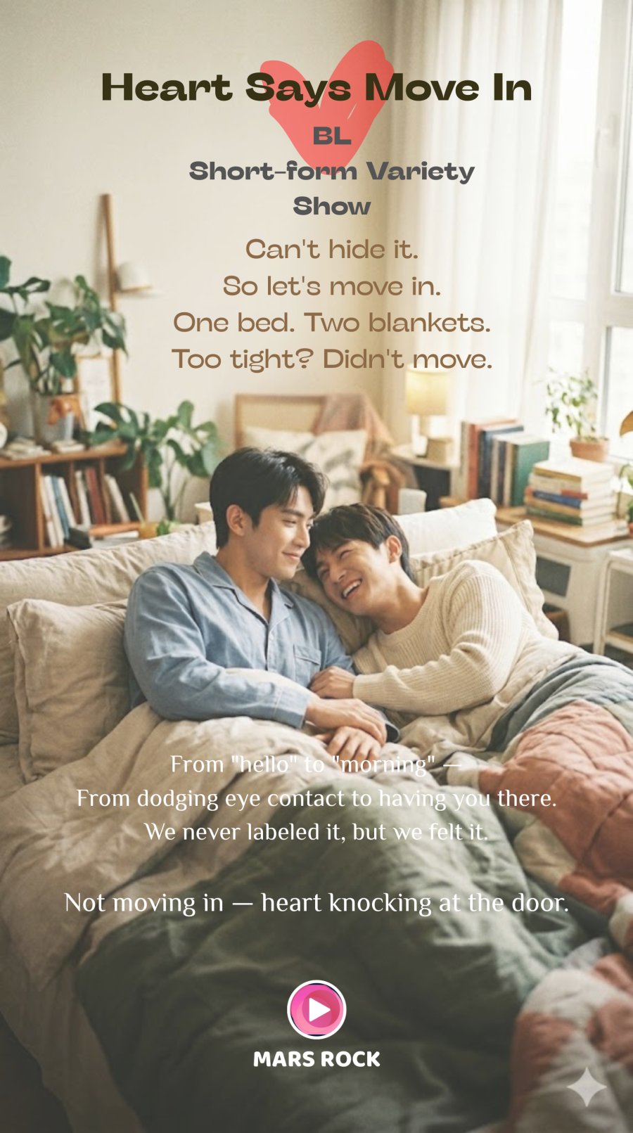 You can't really hide a crush. So let's just try living together. One bed, two blankets. You say it's too cramped, but you didn't move an inch all night. From "hello" to "morning" — From dodging eye contact to having you there. We never labeled it, but we felt it. Not moving in — heart knocking at the door. (Source: BL-MarsRock YouTube) Edit Translation