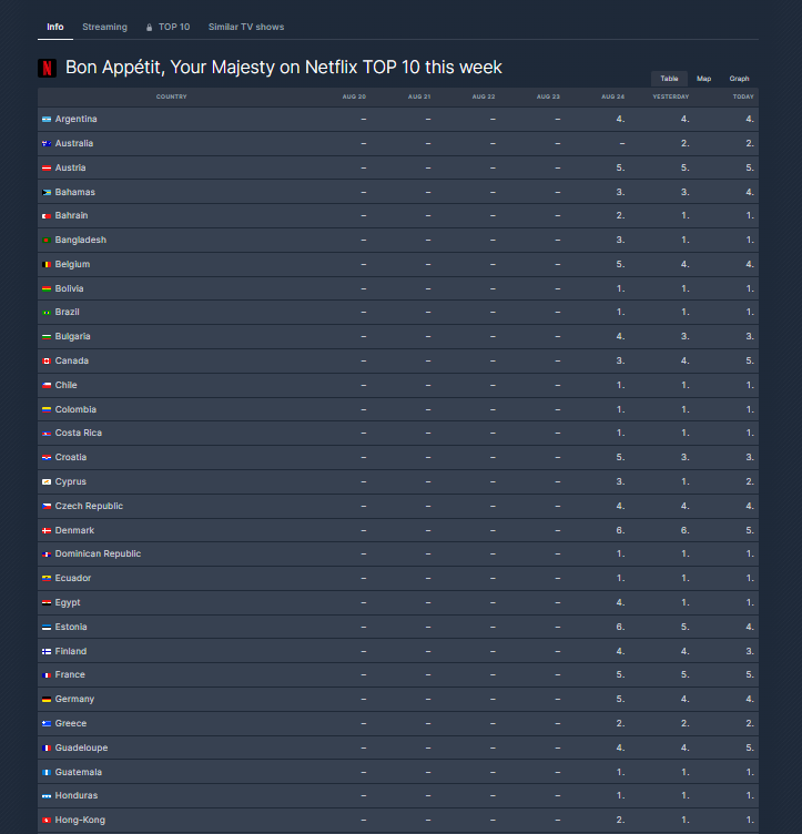 According to FlixPatrol, Bon Appetit, Your Majesty topped the charts in over 40 countries within its first week of release and entered the Top 10 in over 90 countries — Australia, Brazil, Canada, France, Egypt, India, Ireland, Italy, Kuwait, New Zealand, Lebanon, Kenya, Jamaica, Peru, Saudi Arabia, South Africa, United Kingdon, the United States, and the United Arab Emirates, Vietnam, Taiwan, among others — on the global OTT Netflix, as of August 26.