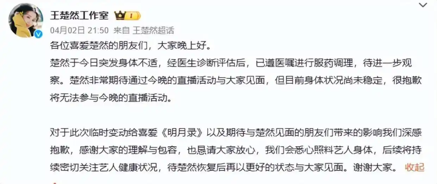 On the evening of April 2, actress Wang Chu Ran reportedly withdrew from a scheduled livestream event for the drama A Ming Dynasty Adventure after suddenly experiencing a health issue.