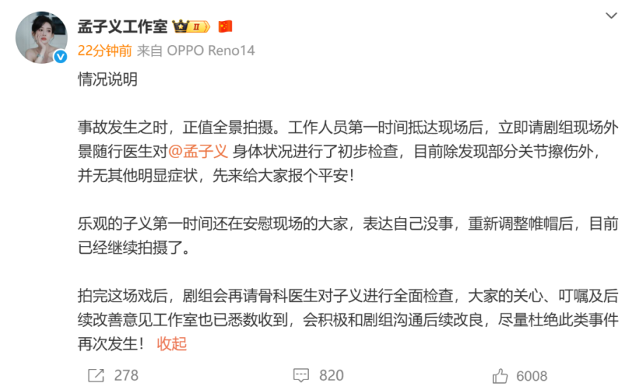 At the time, the studio issued a statement, stating that aside from minor abrasions, no serious injuries occurred. They also stated that after finishing the scene, the production team would arrange for an orthopaedic specialist to conduct a comprehensive examination of Meng.