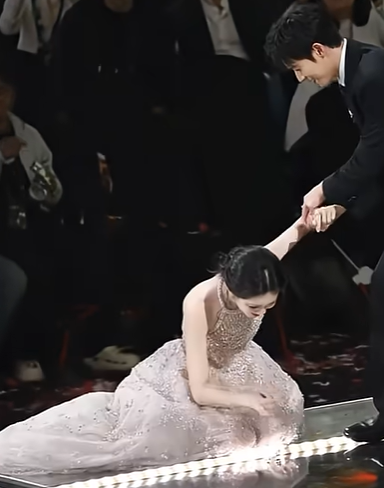 In December of the same year, at the Tencent Video Starlight Awards 2025, she fell while stepping onto the stage (the video of which went viral on Chinese and international social media platforms). While walking on stage, she accidentally stepped on the hem of her own dress with her high heels, immediately losing her balance. She sustained injuries to her knees and legs, yet still insisted on completing her subsequent commitments.