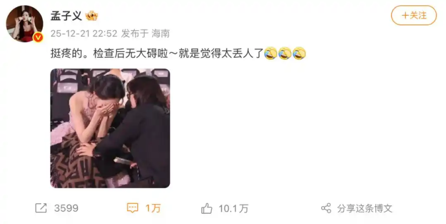 Afterwards, Meng Zi Yi posted a response, saying, "It hurts a bit. I'm fine after the check-up. There are no major issues. I just feel really embarrassed."