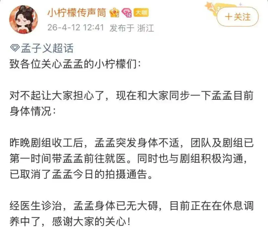Meng Zi Yi's fan communication channel, "Little Lemon Messenger", designated by Meng Zi Yi's studio, issued a statement, saying that after the filming wrapped up last night, Meng Zi Yi suddenly experienced discomfort. She promptly sought medical attention, and following diagnosis and treatment by doctors, it has been confirmed that there's no serious issue. She is currently resting and recuperating.