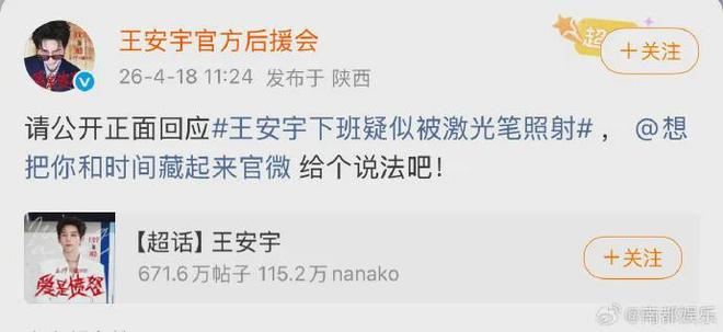 On April 18, Wang An Yu's fan club publicly called out the production team of I Live in Your Time, reporting that while leaving the set after filming, Wang An Yu was targeted with a laser pointer aimed at him, posing a threat to his personal safety.