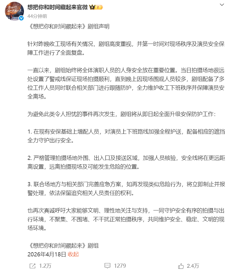 After the issue escalated, the production team of the C-drama (@想把你和时间藏起来官微) released a statement, saying they take this incident very seriously. They also stated that multiple staff members, together with relevant authorities, were deployed to provide protection and ensure the actors could leave safely.