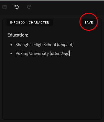 ![]() | After adding the character's school, write out in parentheses, the character's status (graduated, attending, dropout, transferred). Afterwards, click on the "Save" button after you've added all the necessary information. |