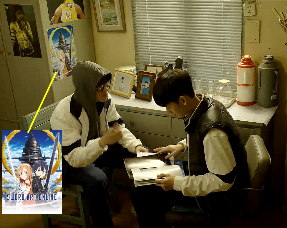 So I took a clearer screencap of that scene so you could see the poster. It's not a BL, it's a poster of Sword Art Online which is a series of books, which were also made into a video game: https://i.postimg.cc/h4rphd5s/clearerpic.png
