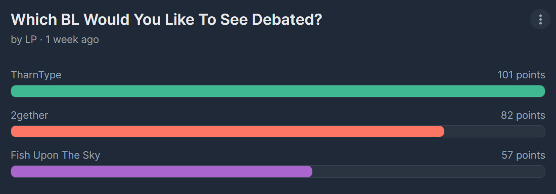 The results are in and the winner for the debate is TharnType! https://i.postimg.cc/j5BJGBpF/results.png Did you watch TharnType, are you a fan? Or did you think it could have been better? On DeBLates you can share your point of view in an open discussion! If you're interested in discussing TharnType and want to have your say about it, contact [email protected]!